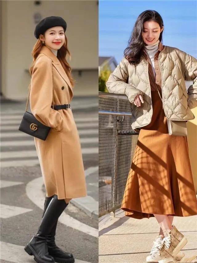 如果真的到了冬天,你还可以用叠加的穿搭方式,用一件羽绒服外套内搭美拉德色系的衬衫,叠加白色针织衫和美拉德色系的鱼尾半身裙,这样的穿衣打扮更有层次感,形成一个撞色的效果,让你的造型配色不会显得那么单调。