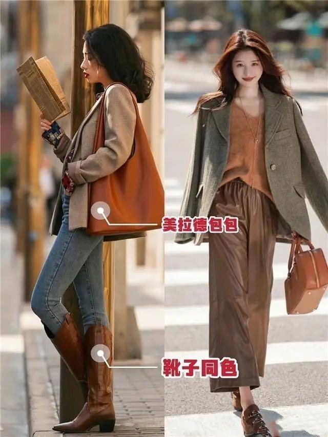 我们还可以在配饰上下点功夫,比如说你用美拉德色系的包包或者是靴子来搭配,这两件单品能形成一个首尾呼应的效果,让整套穿衣配色变得更加协调,而且能增加整体穿衣打扮的档次,何乐而不为?