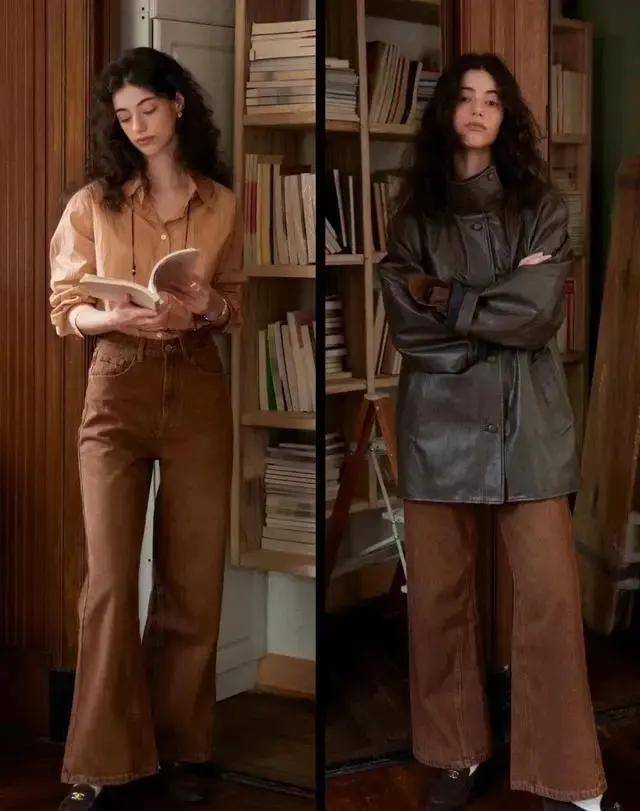 大家有没有发现选择美拉德色系的长裤来搭配,用绒面料的长裤来搭配更好看,例如下面这两位博主的搭配就选择了这样的绒面料长裤,搭配上短款的外套,内搭针织衫或者是翻领打底衫,轻松穿出复古洋气的造型。