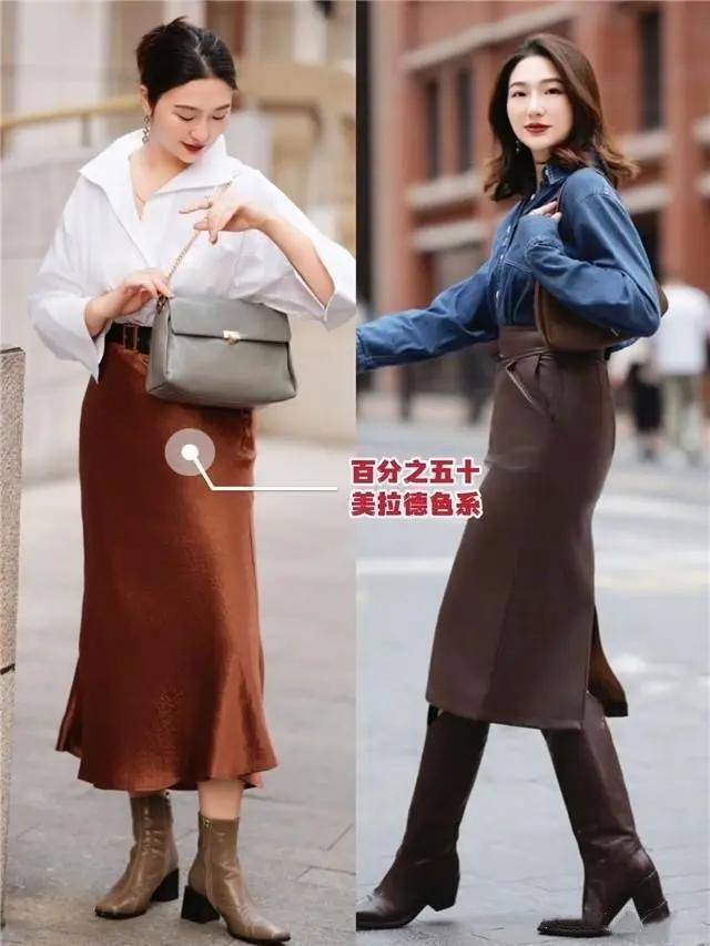 确实,美拉德色系的大衣外套搭配上同样是美拉德色系的皮质半身裙,还有短靴,看起来就有一种高贵感,会比较上档次,这也是为何这几年非常流行这个色系的原因之一,最主要的还有比较百搭耐看。